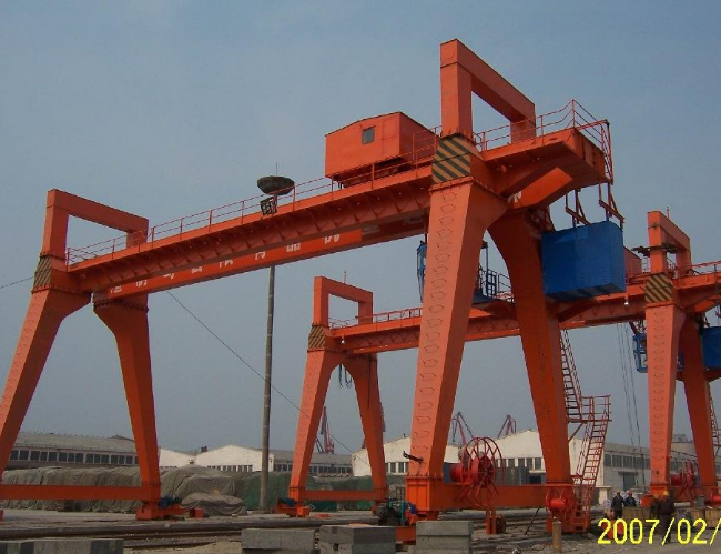 双梁门式起重机型号其型号有:MG、ME、MZ、MC、MP、MS,根据产品外形可以分为U型双梁龙门式起重机、A型双梁门式起重机以及包箱双梁门式起重机、花架双梁门式起重机。本机适用于大跨度,装卸作业频繁的铁路货场、港口、露天仓库、集装箱中转站进行一般性货物的装卸及起重运输工作(同样适用于车间内安装使用)。整机有双主梁桥架、大车运行结构、小车、电气设备等部分组成。